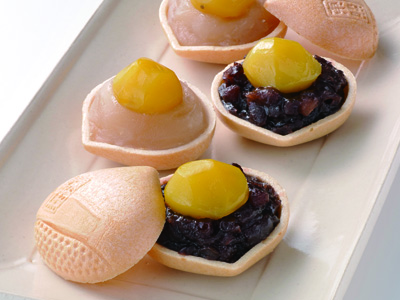 芳ばしい最中種に、豊かで深い上品な甘みの特製餡と、特大の栗がまるまる一粒入った贅沢な逸品。小豆の風味豊かな粒あん・クセがなくファンの多い白手亡豆の白あん、二種類をお詰めしております。